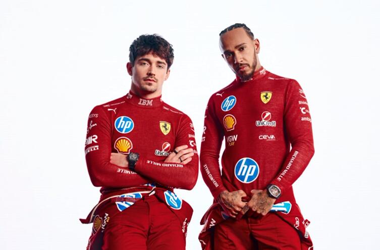 法拉利F1车队车手刘易斯·汉密尔顿(右)与夏尔·勒克莱尔(左)佩戴RICHARD MILLE RM 43-01腕表